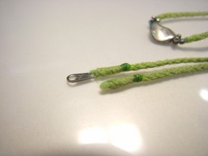 シルクコードの紐に直接付いていた留め具が取れたので、新たに金具(かつら)を付けます。